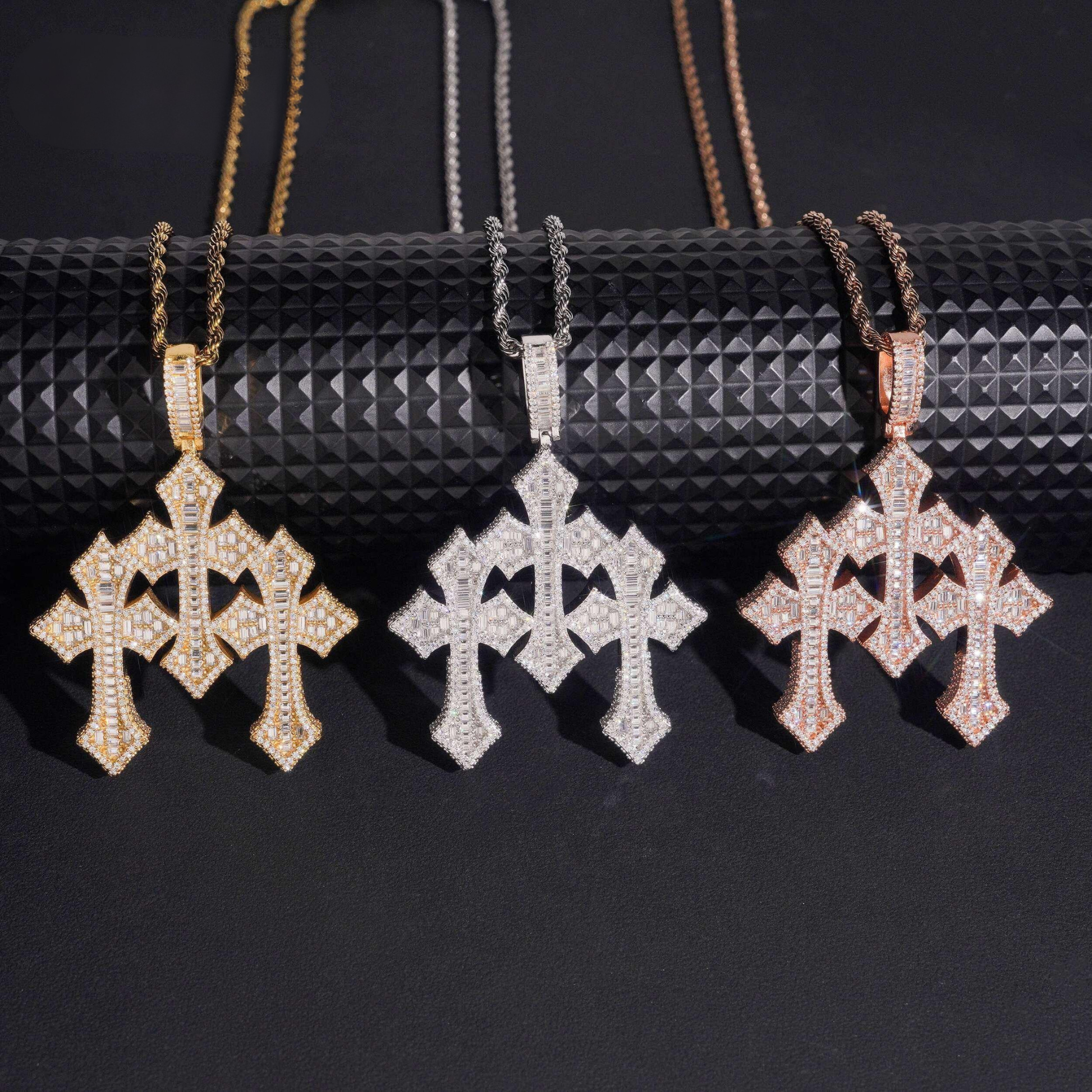 - Design: Three Cross Pendant with Iced-Out Setting
